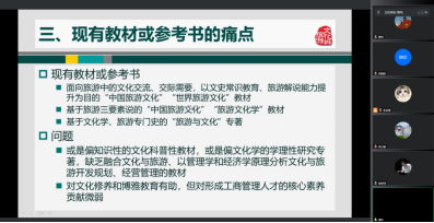 “文化与旅游”教学团队负责人周玲老师从课程基本情况、教学实施与反馈、教材编写三个方面进行了汇报。“文化与旅游”课程是pg官网2019版工商大类学科本科培养计划中的学科基础课,2020年至今开课3轮。周玲老师分别从教学内容与环节、教学方法、课程教学环节与考核总结教学经验,分析目前存在的问题,提出可行的完善措施;并针对下一步课程教材编写重难点内容和进度计划进行安排。