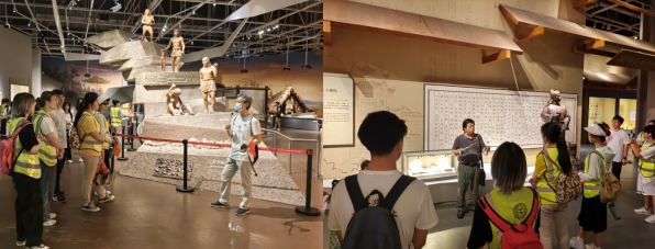 场馆参观环节,旅游管理专业教师与旅游管理专业085211班同学为大家呈现了有深度、有温度、有思考、有感悟的精彩讲解。在长江文明馆的序厅,李江敏老师为大家介绍长江文明馆的建成历史、设计理念和意义,并引导同学们欣赏黄金辉先生的长诗《父亲江》,感受诗人笔下长江文明奔腾不息的生命力,以及中华文化的和谐统一之美。